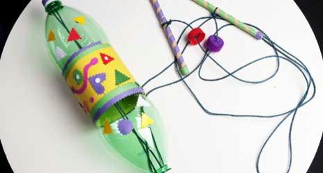 Depois, passe os dois pedaços de varal pelo gargalo de uma das partes e coloque também as tampinhas coloridas para proporcionar um visual diferente. Uma as duas partes das garrafas na forma de cilindro e passe uma fita crepe no meio.